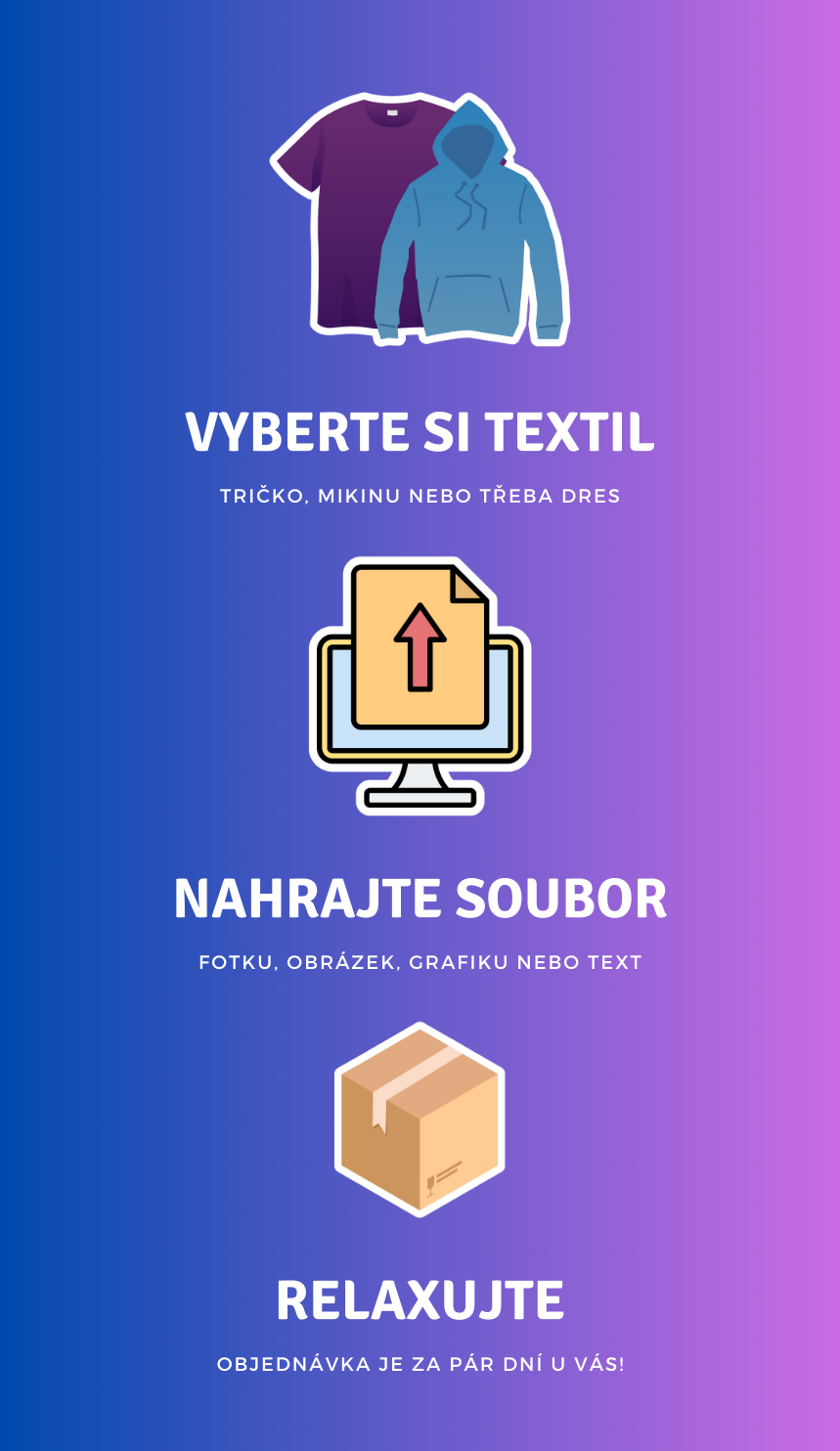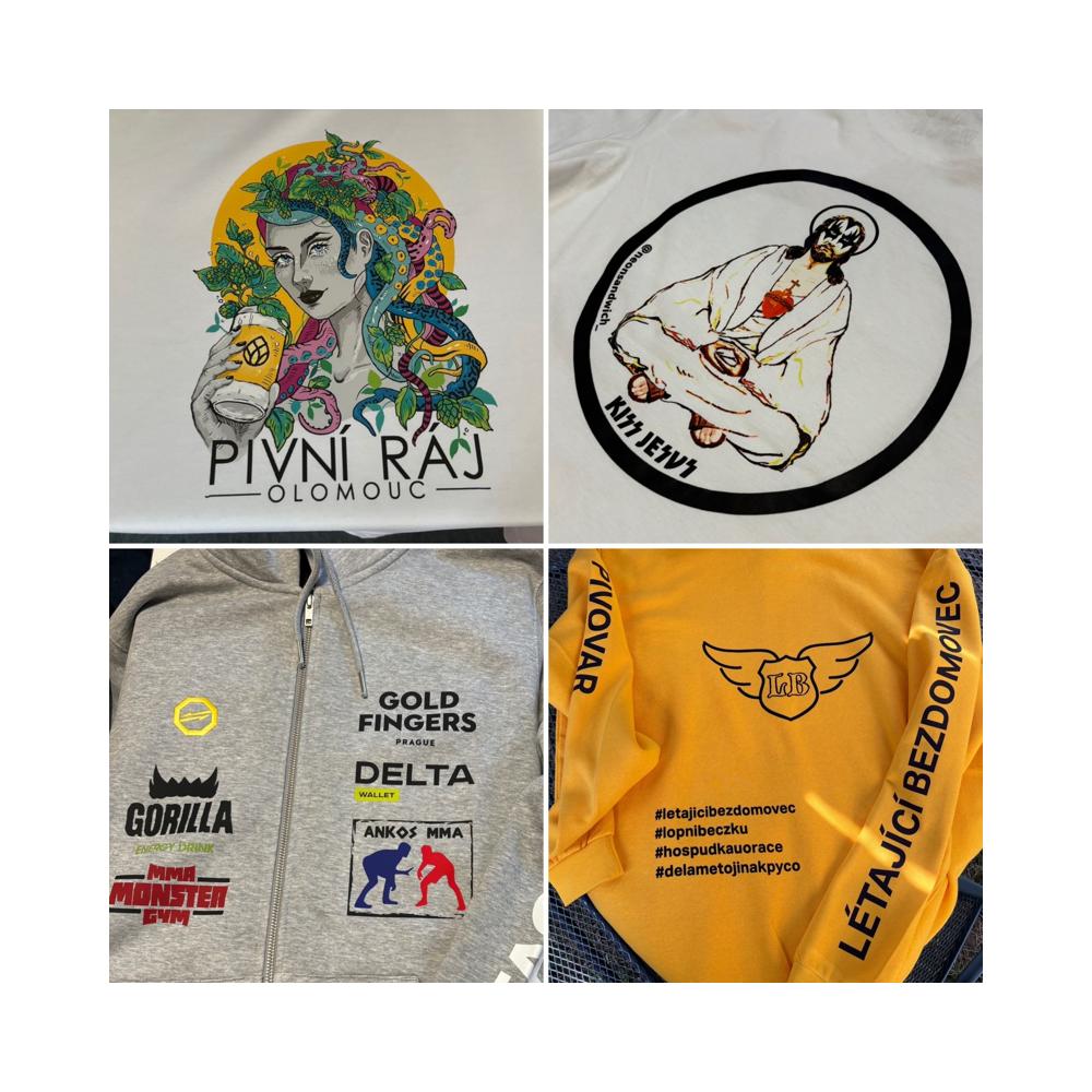 Navrhněte si tričko, mikinu nebo třeba dres s vlastním potiskem a objednejte rovnou přes náš e‑shop. Jednoduchý a rychlý nákup, ideální už od jednoho kusu.